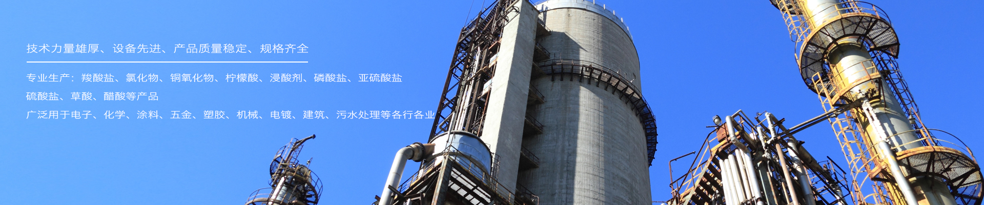 公司位主要產(chǎn)品有:羧酸鹽、氯化物、銅氧化物、檸檬酸、浸酸劑、磷酸鹽、亞硫酸鹽、硫酸鹽、草酸、醋酸等,廣泛用于電子、化學(xué)、涂料、五金、塑膠、機(jī)械、電鍍、建筑、污水處理等各行各業(yè)。
